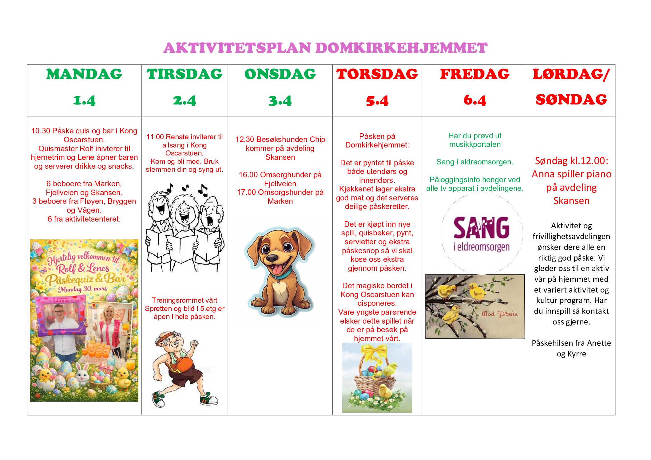 Vi inviterer beboerne til hyggelige sammenkomster i Kong Oscarstuen og på treningsrommet vårt Spretten og blid i 5.etg. Dette er annonsert på aktivitetsplanen vår. Det blir lagt opp til sykkelturer hvor beboerne kan se på film og høre musikk samtidig. I tillegg så er det et godt felleskap rundt dette med mye latter og glede.